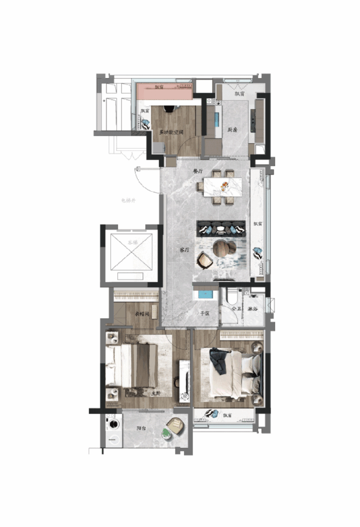 这个户型能保证一个家庭未来数十年的生活需求,适合想要一步到位的改善家庭。